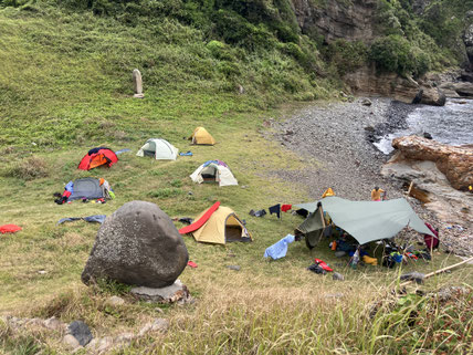 この日はゴロタ浜を少し登ると気持ちの良い原っぱのあるところでテント泊。